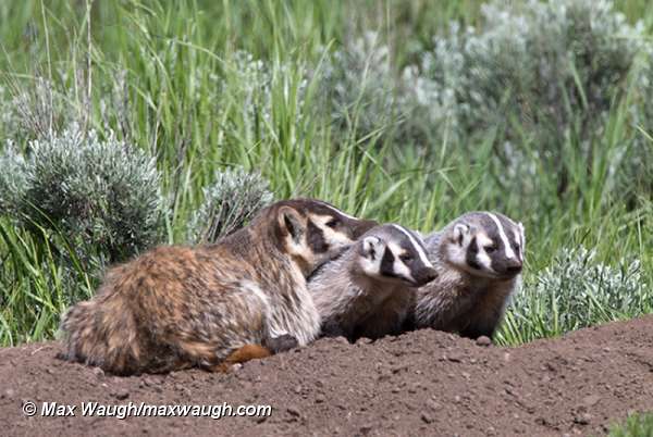 This badger dug a sett right next to the road that leads to the Slough Creek campground. The sett was located about 200 yards beyond the open metal gate at the bottom of the first hill as you drive down the road (from the main road), on the east side of the road. Based on reports, the adults seemed to be most active around the den earlier in the morning (7-7:30am), sometimes bringing back food following short hunting excursions. She would then venture out for longer periods, sometimes four or five hours before finally returning at midday or early afternoon. When the adult first returned on this day, she was very wet, leading me to wonder if she swam the creek (I've heard of this happening at Slough Creek before). |