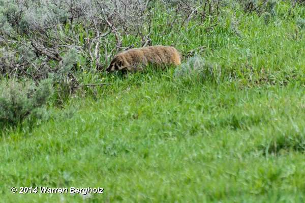 | Notes: | Badger emerged from under Cabin 9 at Lamar Buffalo Ranch and slowly wandered up and around north of the parking lot to the sage north and east of the parking lot and spent time patrolling that area. Did not seem bothered by a number of viewers. Finally after about 10 minutes, slowely continued east and out of sight. No digging just seemed to be patrolling the area. |