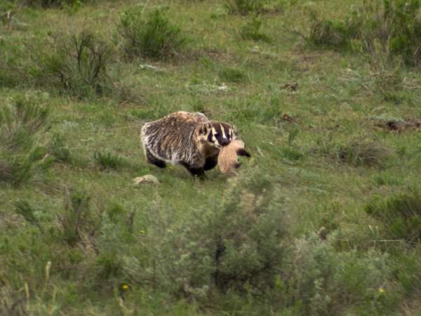 | Notes: | The adult badger was by the side of the road. I stopped my car in a pullout to take pictures. The badger stayed by her den entrance for a bit, then crossed the street and disappeared in the grass. A short while later she returned carrying a baby. She waited by the road for a few cars to go by, then crossed back over and took the baby into the den. |